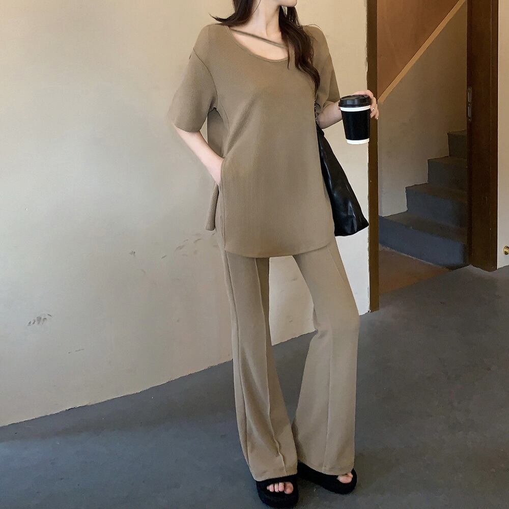 ゆったり アンサンブル 着やせ おしゃれ 半袖カットソー フレアパンツ 冷感タッチ 上下セット 無地 韓国 ハイウエスト