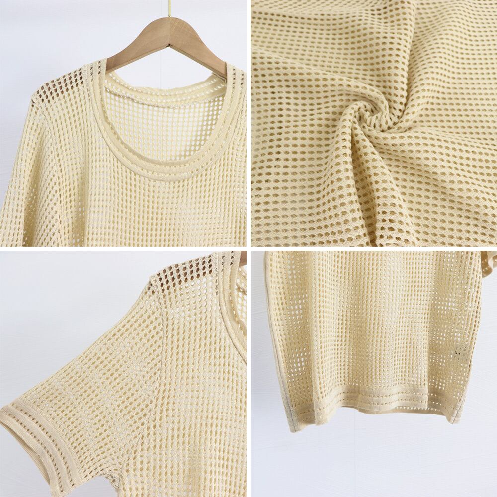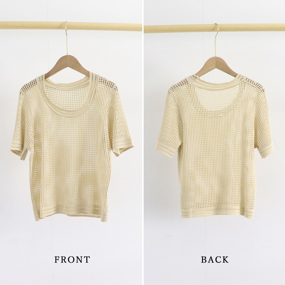 メッシュ編みの涼しげな印象かつさりげなく肌見せしてヘルシーセクシーな透かし編みサマーニットトップスが新作登場