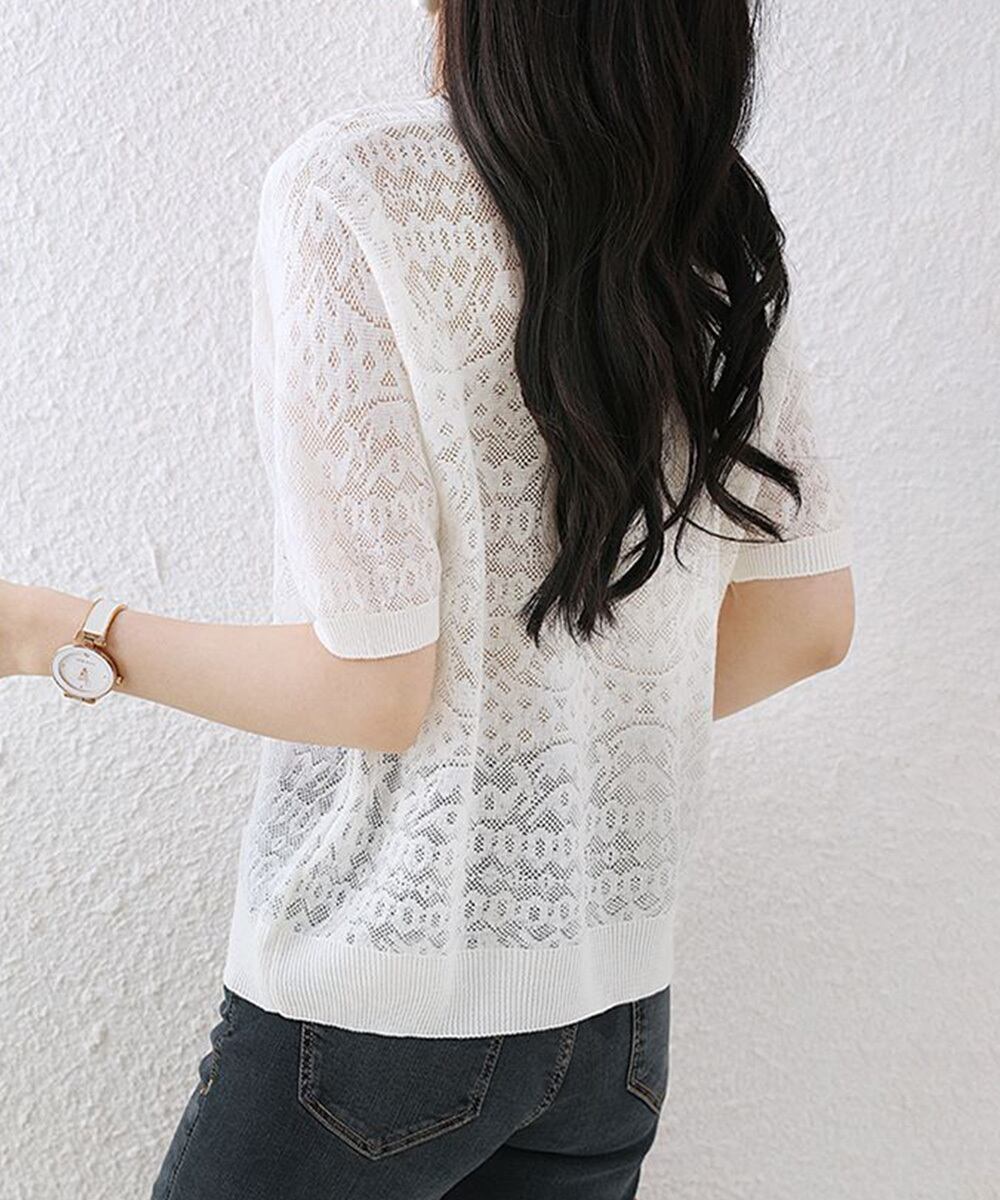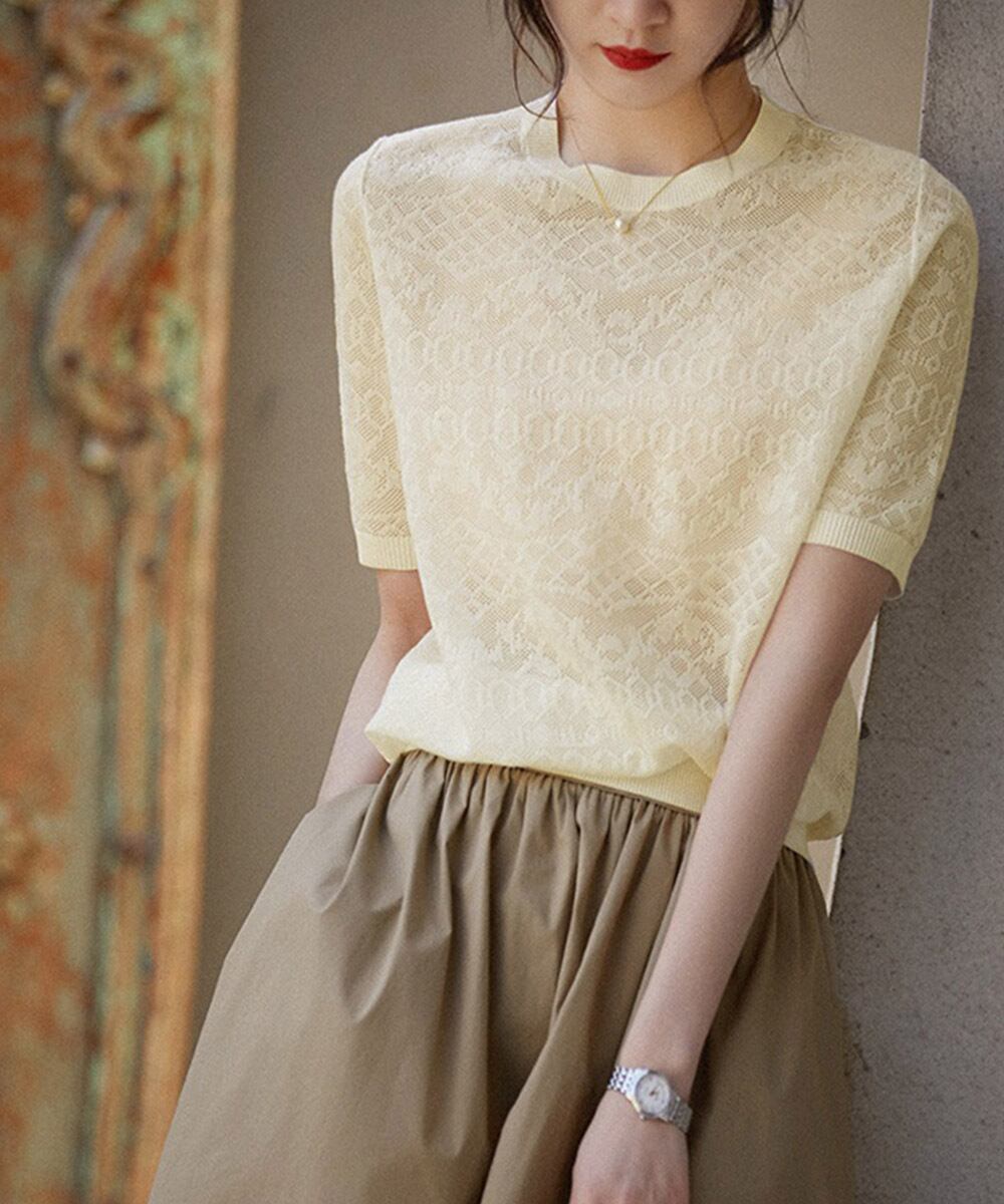 柔らかな風合いの透かし編みが、レディライクな華奢感をだしてくれるジャガードニットトップス