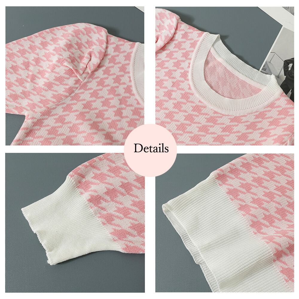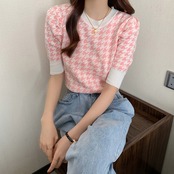 パフスリーブ ラウンドネック ニットトップス 千鳥格子柄 韓国プルオーバー カジュアル 五分袖ニットソー レトロ春秋夏