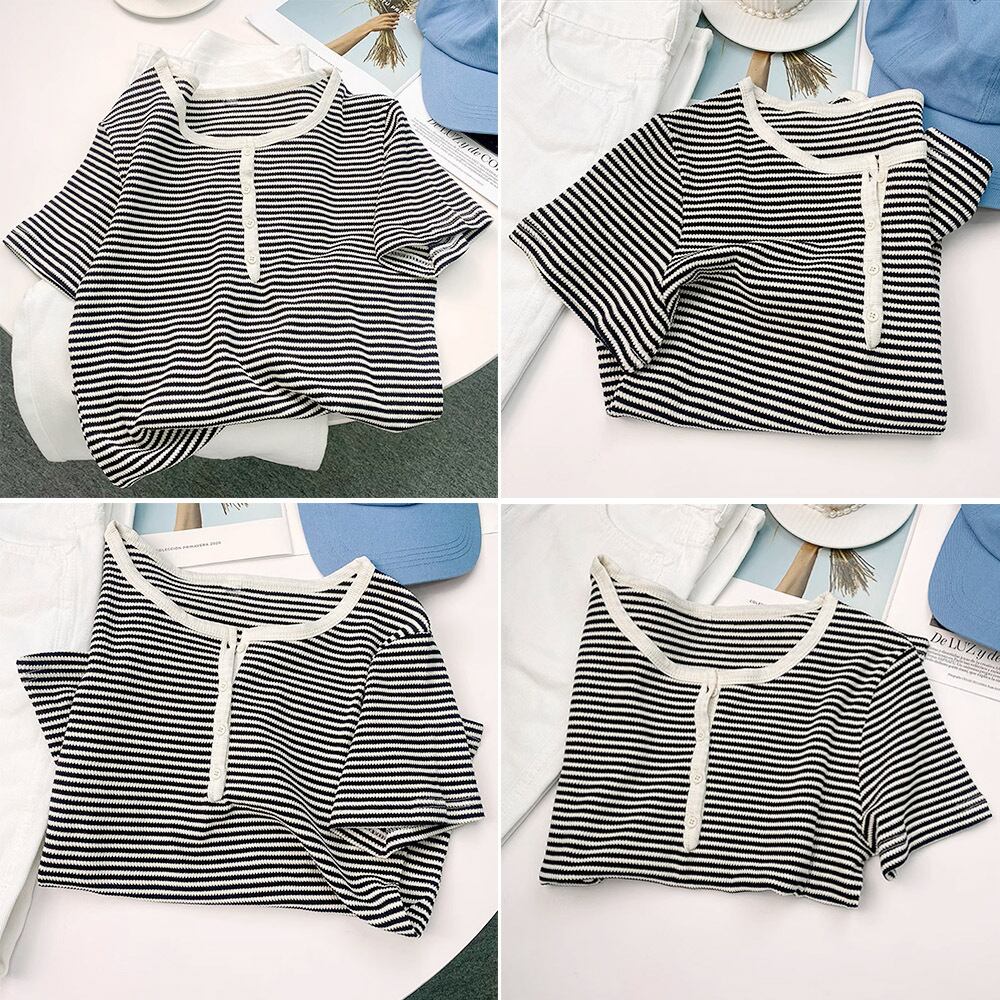 ハーフボタンデザインが爽やかな印象を与え、襟パイピングが上品さを演出する半袖サマーニット
