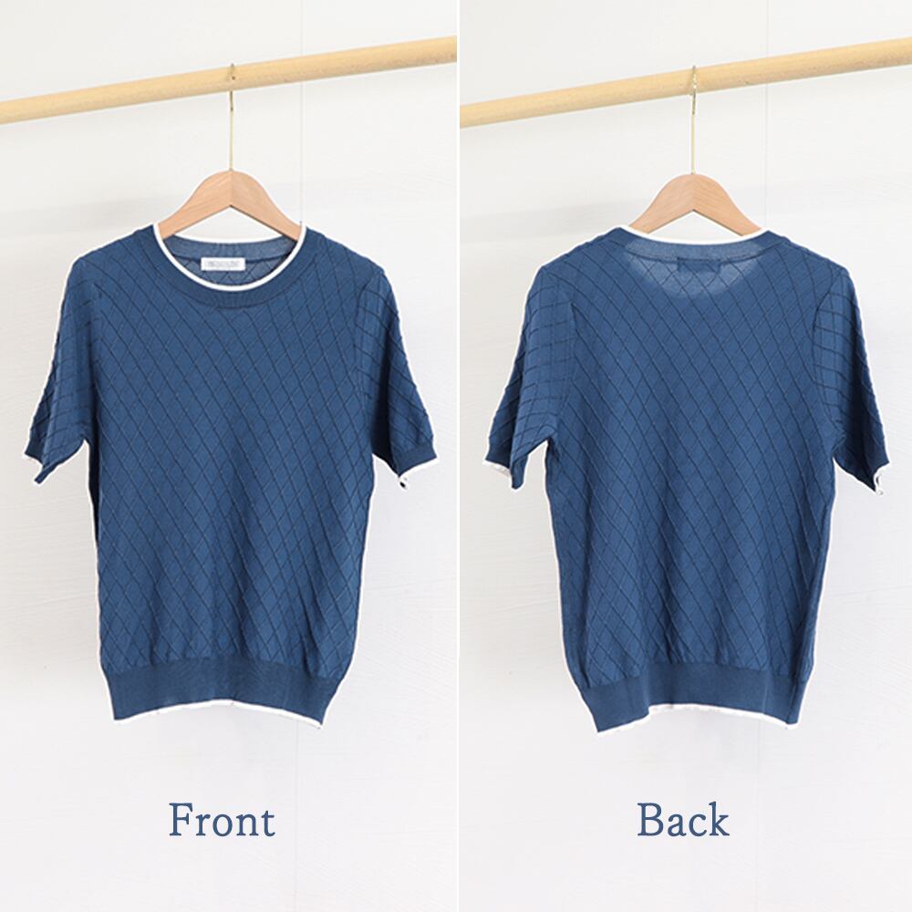 丸襟ニットひし形柄 ニットTシャツ通勤 シンプルニット無地