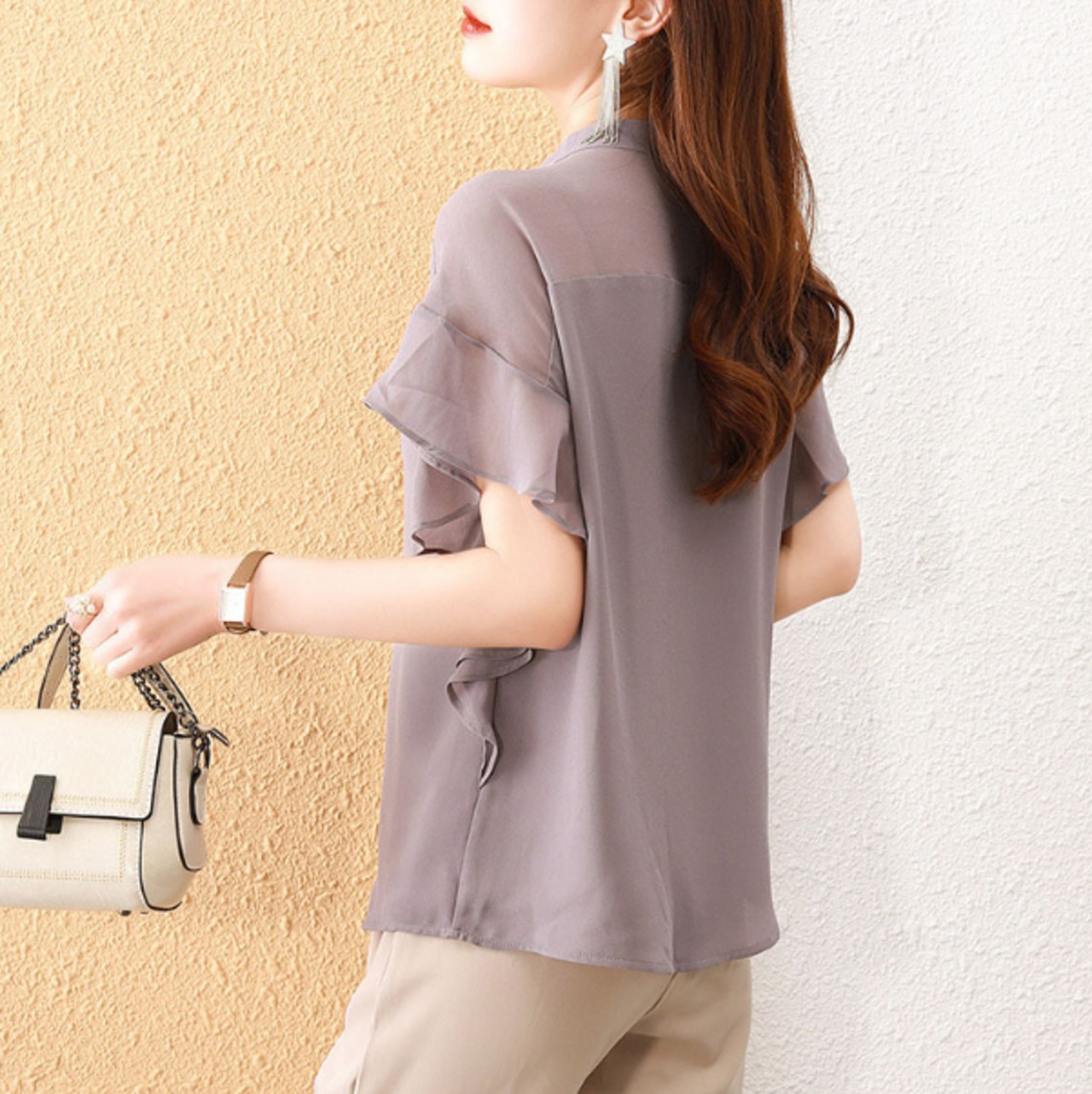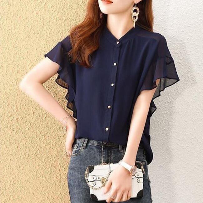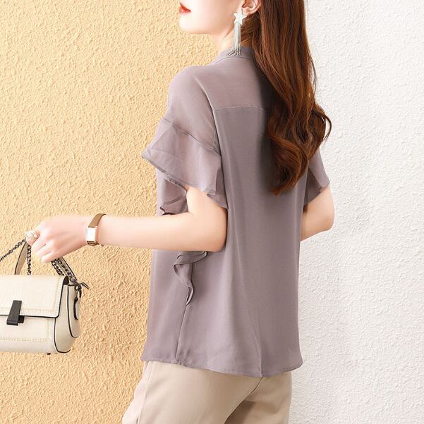 シャツ ブラウス レディース ボリュームスリーブ 通勤 OL 半袖 夏服 フレア袖 前開きシャツ オフィスコーデ