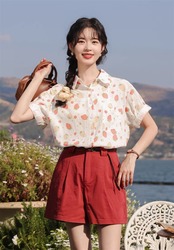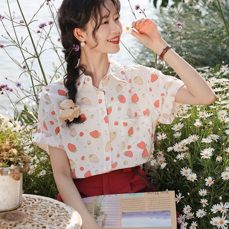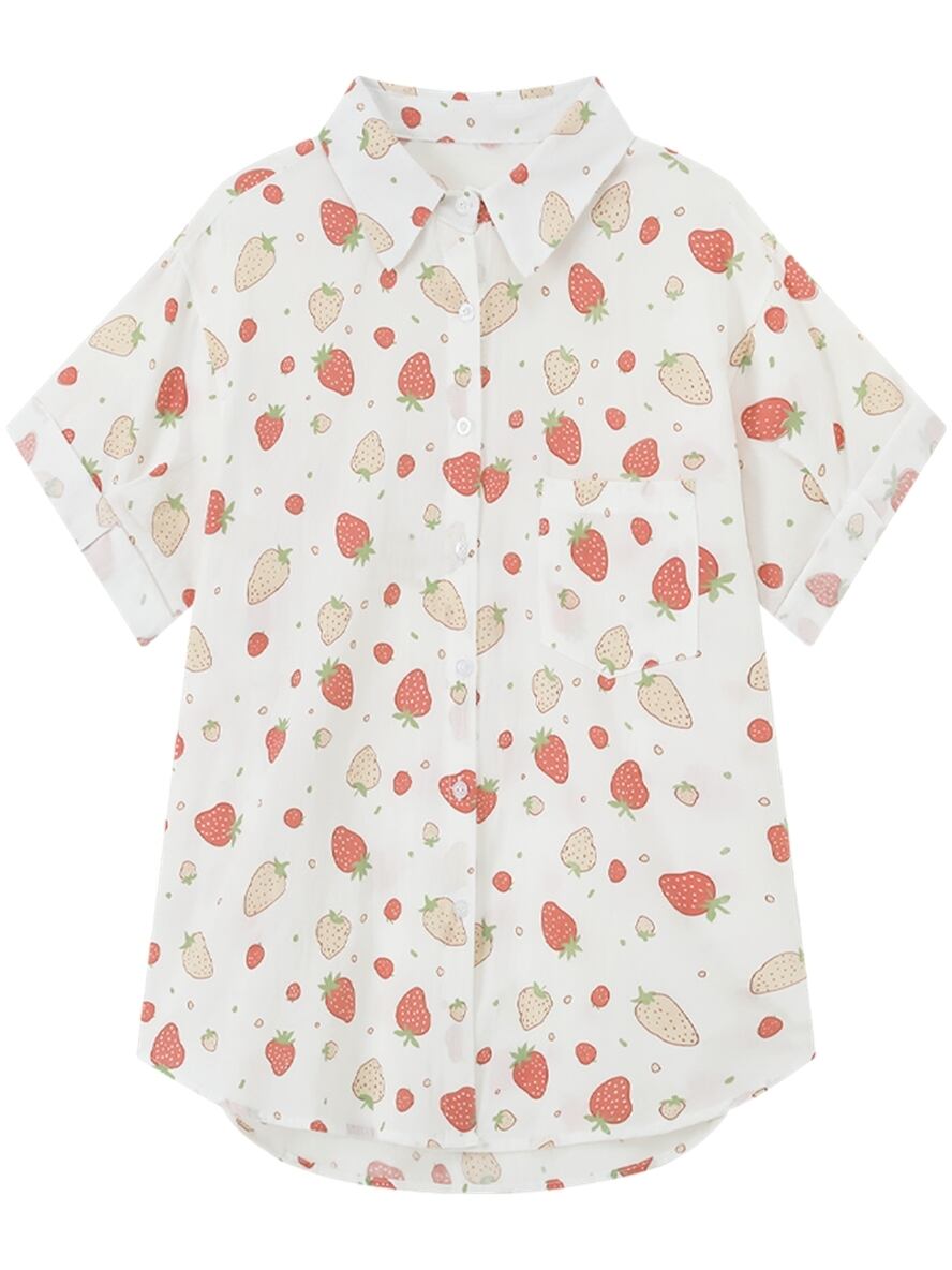 ゆるい いちご柄 シャツ レディース半袖 シャツ 夏服 いちご雑貨 イチゴ柄